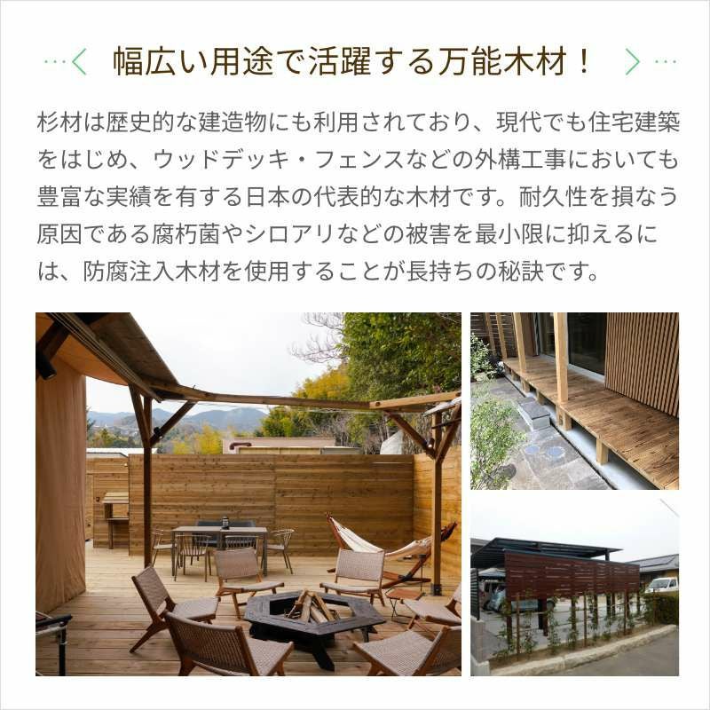 杉材は歴史的な建造物にも利用されており、現代でも住宅建築をはじめ、ウッドデッキ・フェンスなどの外構工事においても豊富な実績を有する日本の代表的な木材です。耐久性を損なう原因である腐朽菌やシロアリなどの被害を最小限に抑えるには、防腐注入木材を使用することが長持ちの秘訣です。